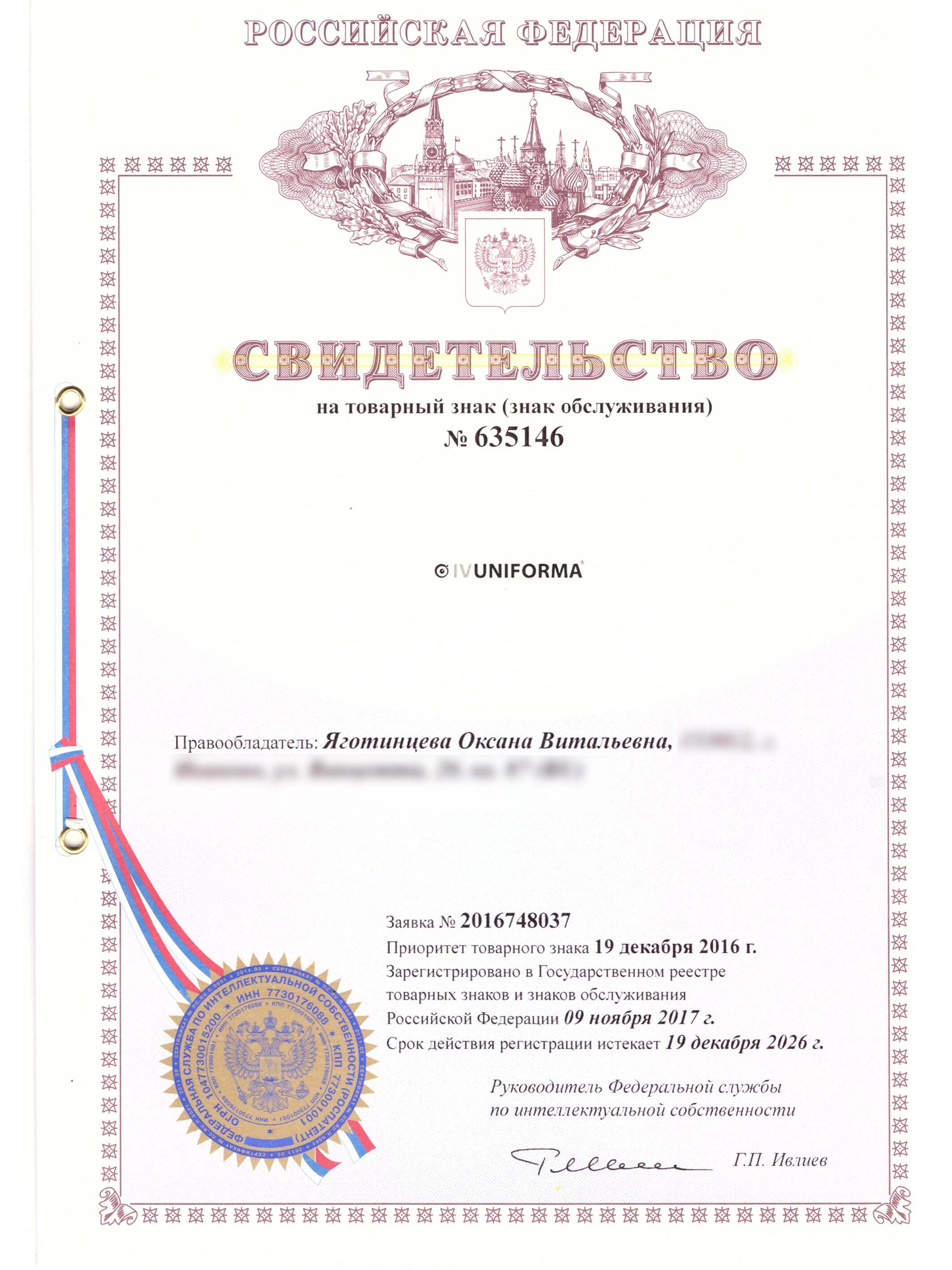 Свидетельство на товарный знак. (Патент)