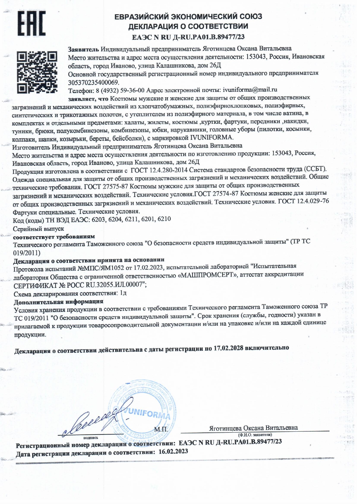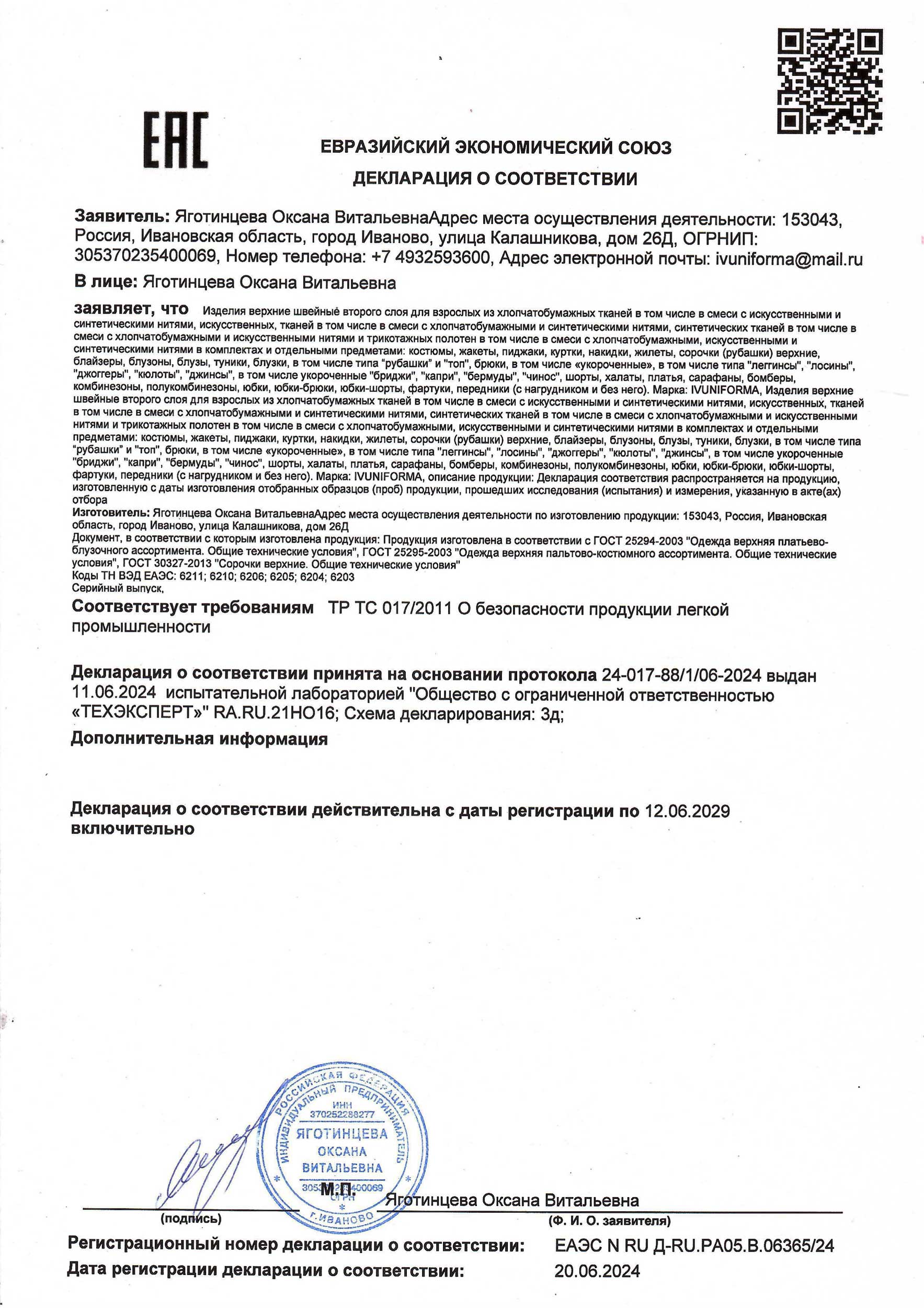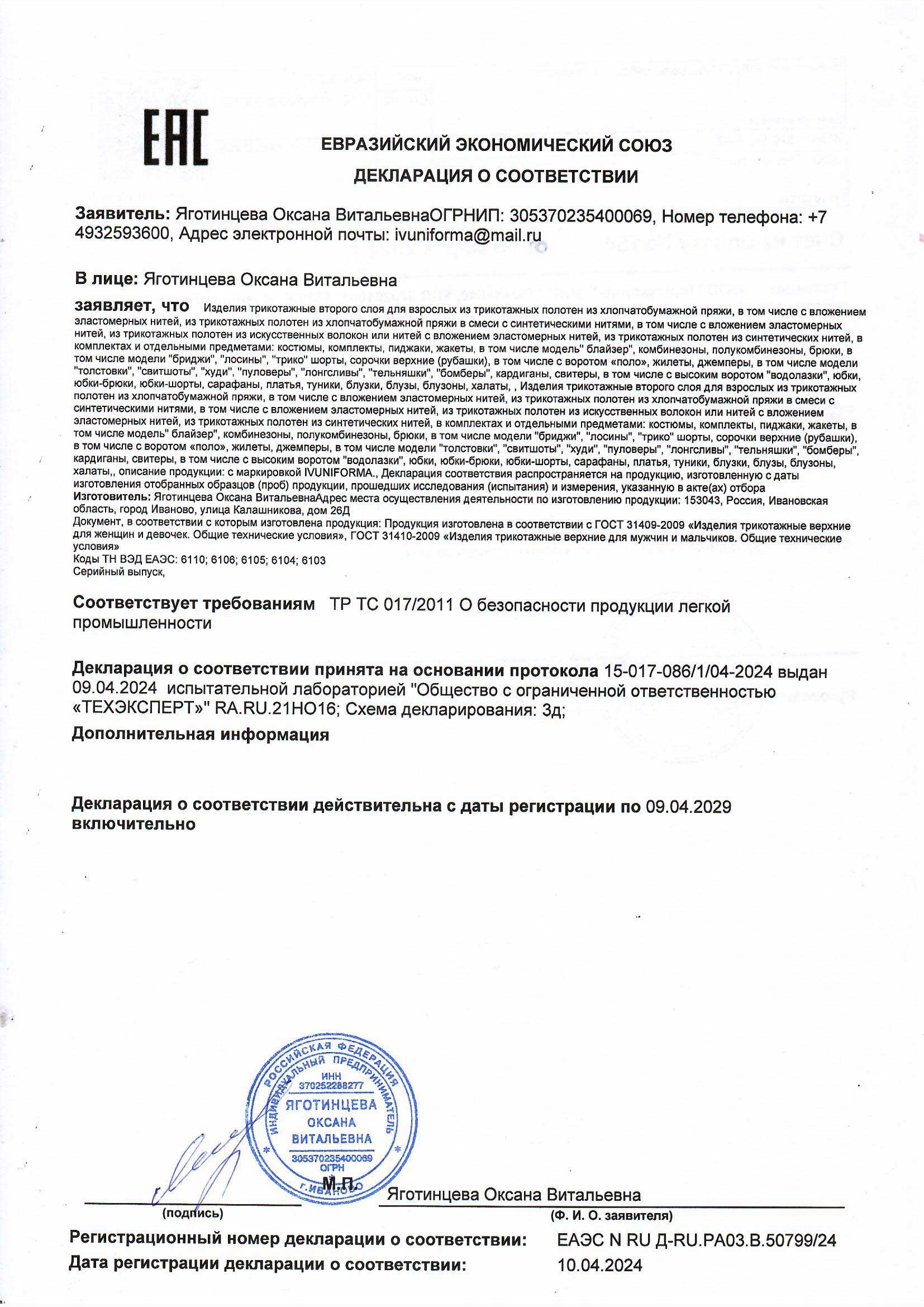 Декларация о соотвествии на изделия трикотажные второго слоя (6211,6210,6206,6205,6204,6203)