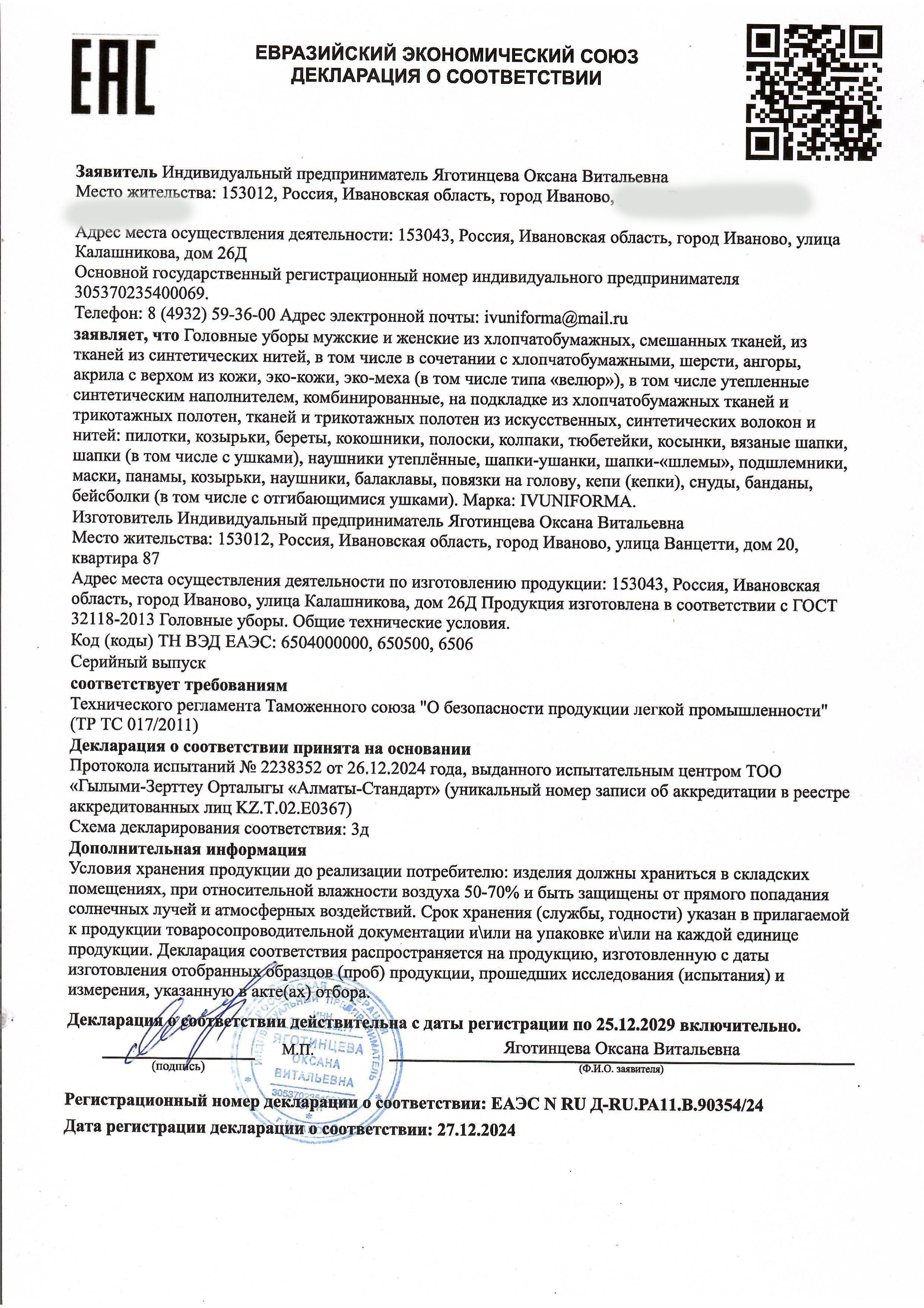 Декларация о соответствии на головные уборы
